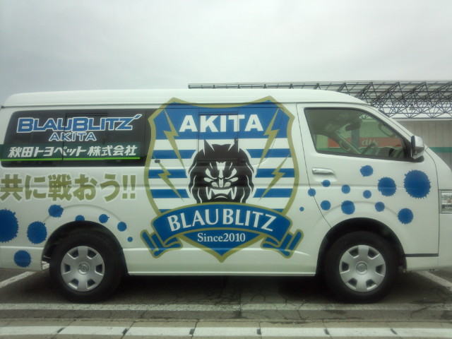 秋田市内の某所にいたら視界の端に目にうるさい車が見えて…カルピスの車かと思ったら我らがブラウブリッツ秋田のハイエースだった。